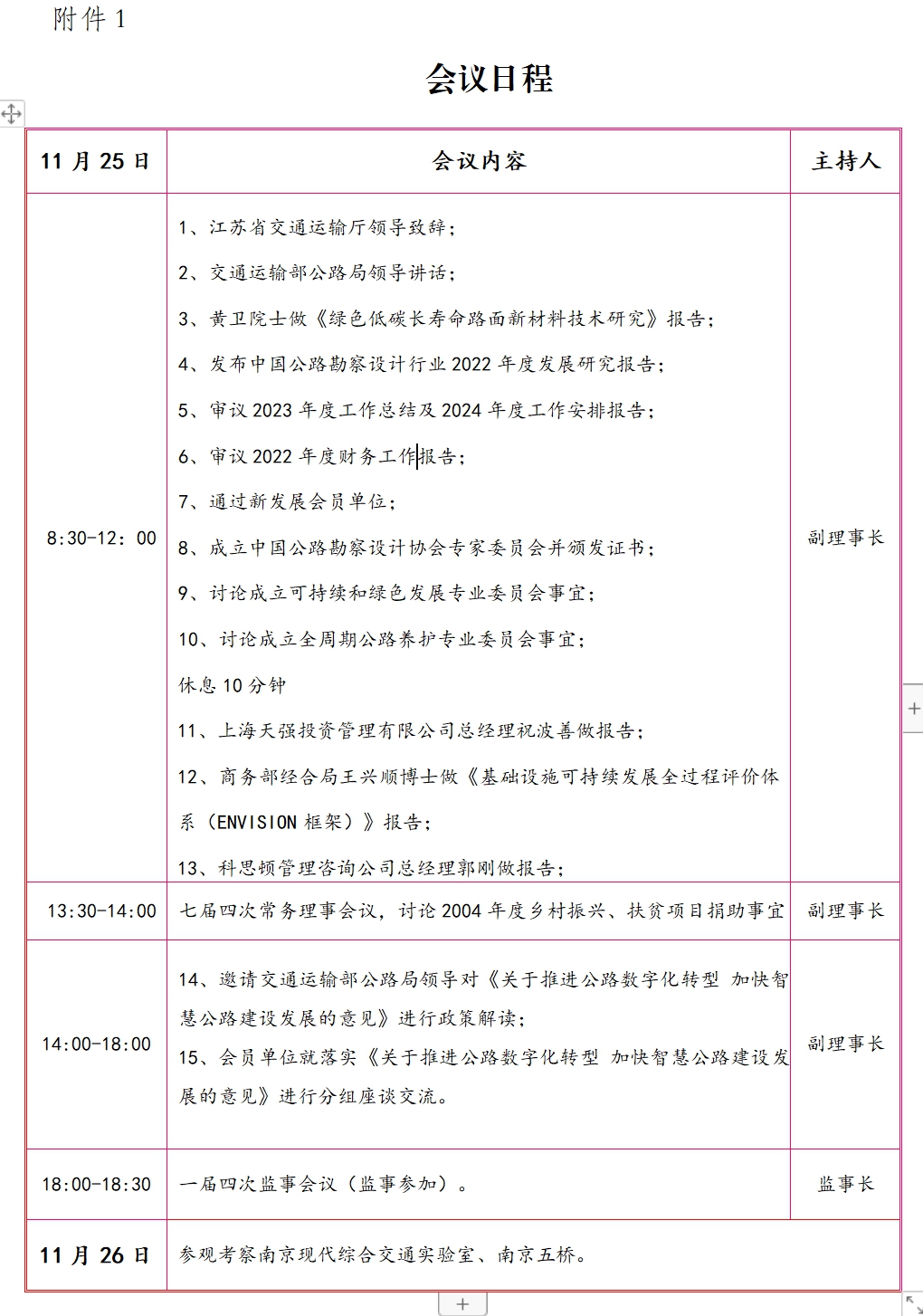 为加强公路勘察设计企业之间的交流沟通,中国公路勘察设计协会定于2023年11月24~26日在江苏南京召开第七届理事会第三次理事会议、第七届理事会第四次常务理事会议、第一届监事会第四次会议(监事参加)。现就有关事项通知如下: