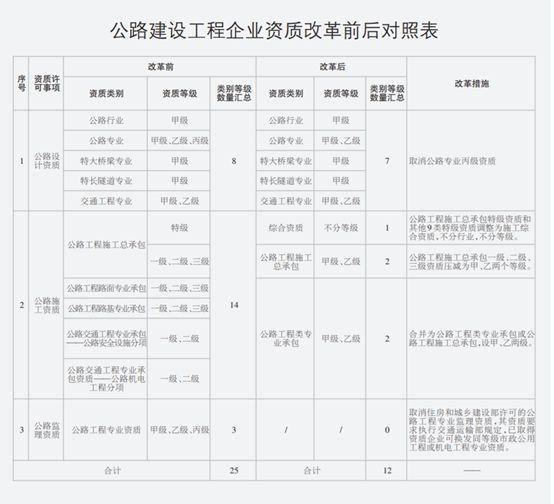 《改革方案》直接取消了住房和城乡建设部门许可的公路、水运、水利等专业监理资质,明确上述专业资质执行行业主管部门规定;已取得住房和城乡建设部门许可的公路工程专业监理资质的,可换发同等级市政公用工程或机电工程专项资质。改革后,解决了重复审批问题,由交通运输部对公路工程监理企业资质进行统筹管理,是建设高效规范的公路监理市场的充分体现,对于公路监理企业是一个极大的利好,真正让公路监理企业享受到改革的成果。